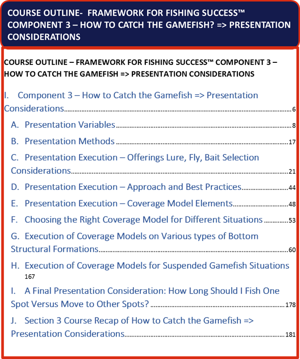 The third component of the framework addresses factors you should consider when determining how to successfully present to, or fish for, and catch gamefish in the productive areas identified in section two of the framework. We collectively call these Presentation Considerations.