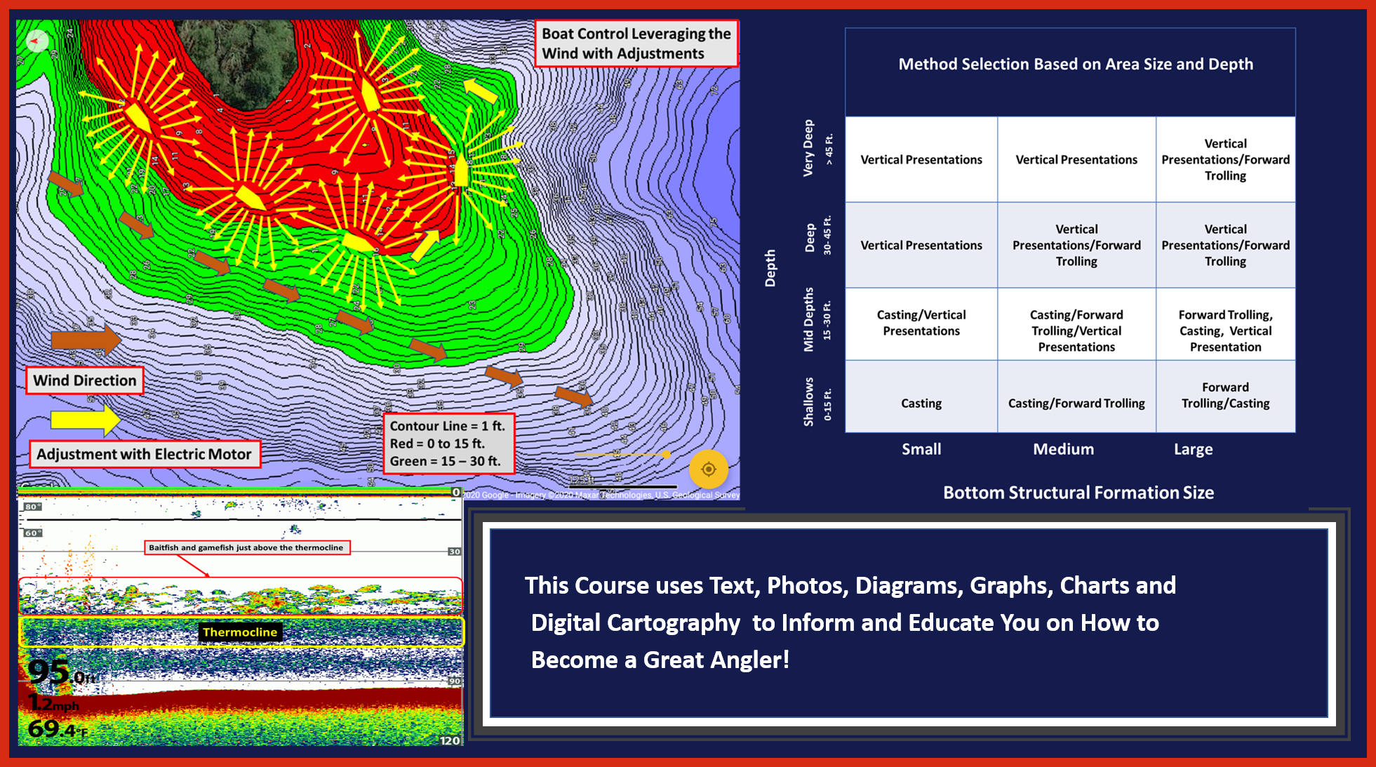 • Presentation execution approach and application through numerous examples of situational analysis and coverage models to deploy when fishing all of the different types of bottom structural formations and for suspended gamefish.