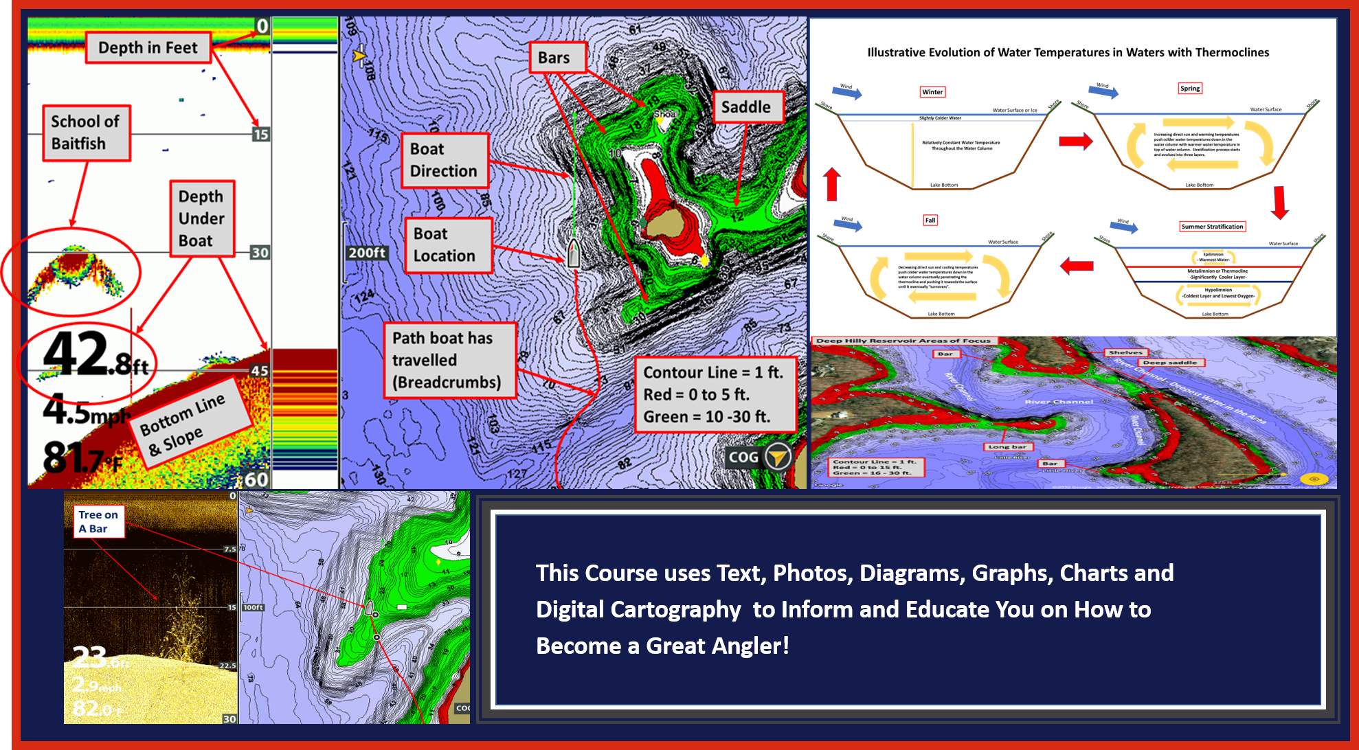 The objective of this section is to save time by showing you how to identify and interpret the best spots, eliminating unproductive sections of the water and maximizing your fishing success. by focusing on the most productive spots, whether your targetd gamefish are relating to the roughly thirteen different types of bottom structural formations that attract and hold gamefish, or when the gamefish are suspended in the water column.